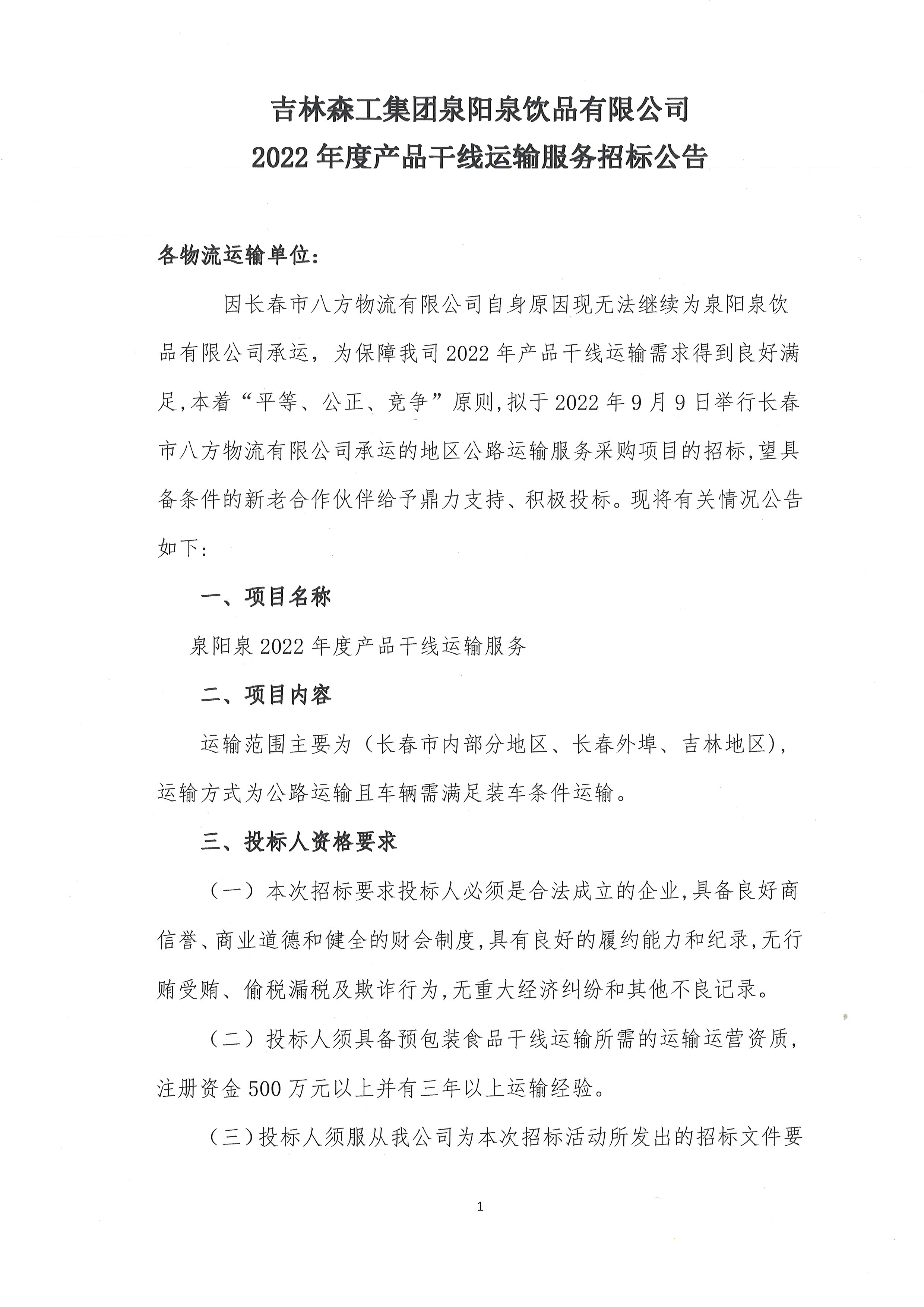 2022年度產(chǎn)品干線運輸服務(wù)招標(biāo)公告