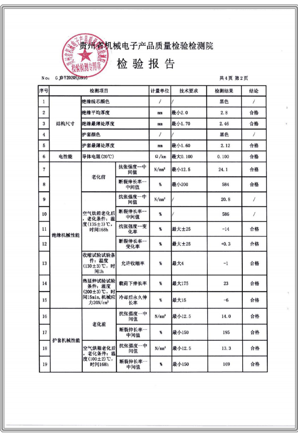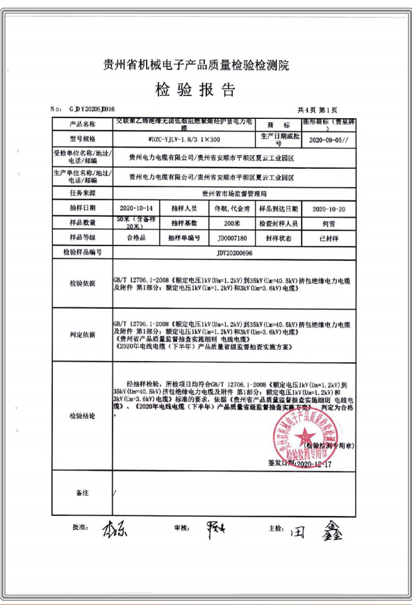 交聯(lián)聚乙烯絕緣無鹵低煙阻燃聚烯烴護套電力電纜 檢驗報告